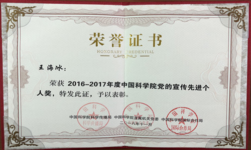 日前,为鼓励在中国科学院科学传播工作中做出突出成绩的集体和个人,依据有关管理办法,院科学传播局、直属机关党委、国际合作局坚持 “科学严谨、目标导向、公正公平、注重实效” 的原则,共同组织开展了2016—2017年度中国科学院科学传播奖的评选工作,共评选出先进单位奖10个,单项集体奖24个,先进个人奖24个。沈阳分院荣获科学传播先进单位奖、党的宣传先进单位奖,王海冰获得党的宣传先进个人奖。
