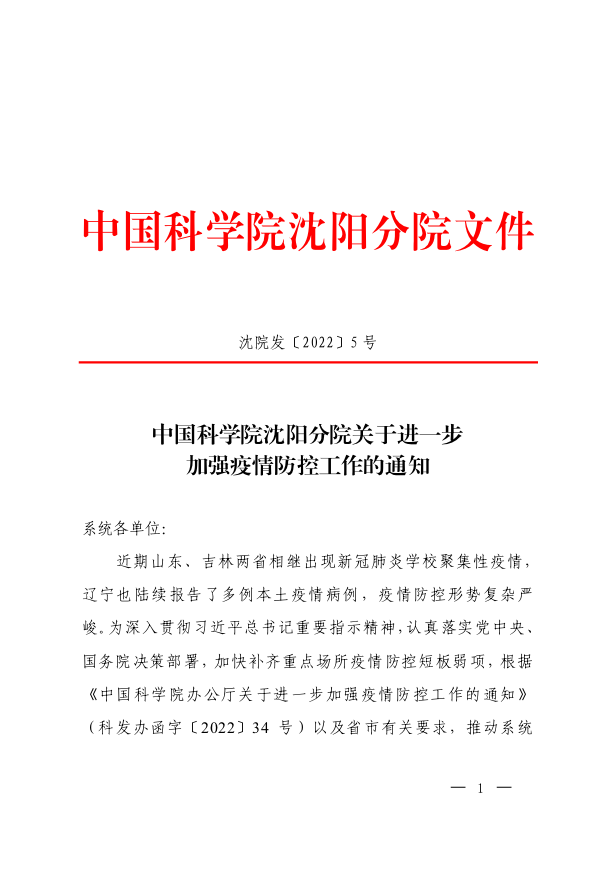 《中国科学院沈阳分院关于进一步加强疫情防控工作的通知》