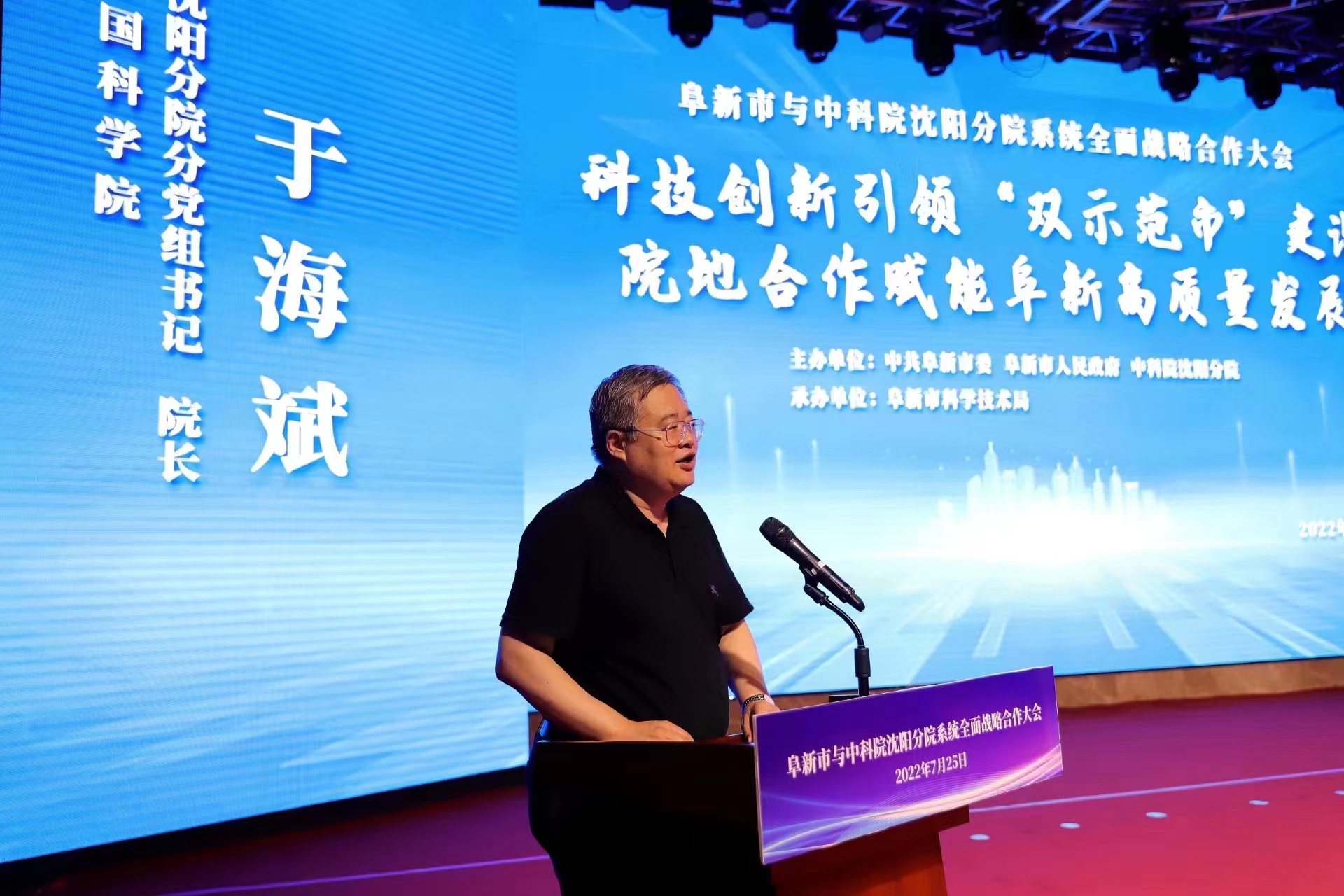 7月25日,沈阳分院与阜新市人民政府在阜新市召开全面战略合作大会。沈阳分院分党组书记、院长于海斌,副院长马越红,分党组副书记毛志远,纪检组组长杨宏,辽宁省科学技术厅副厅长杜波,阜新市委书记胡涛,市长周鹏举出席会议。沈阳分院系统各单位、阜新市政府相关部门、各县市区及部分企业代表参加会议?;嵋橛筛沸率惺谐ぶ芘艟僦鞒?。