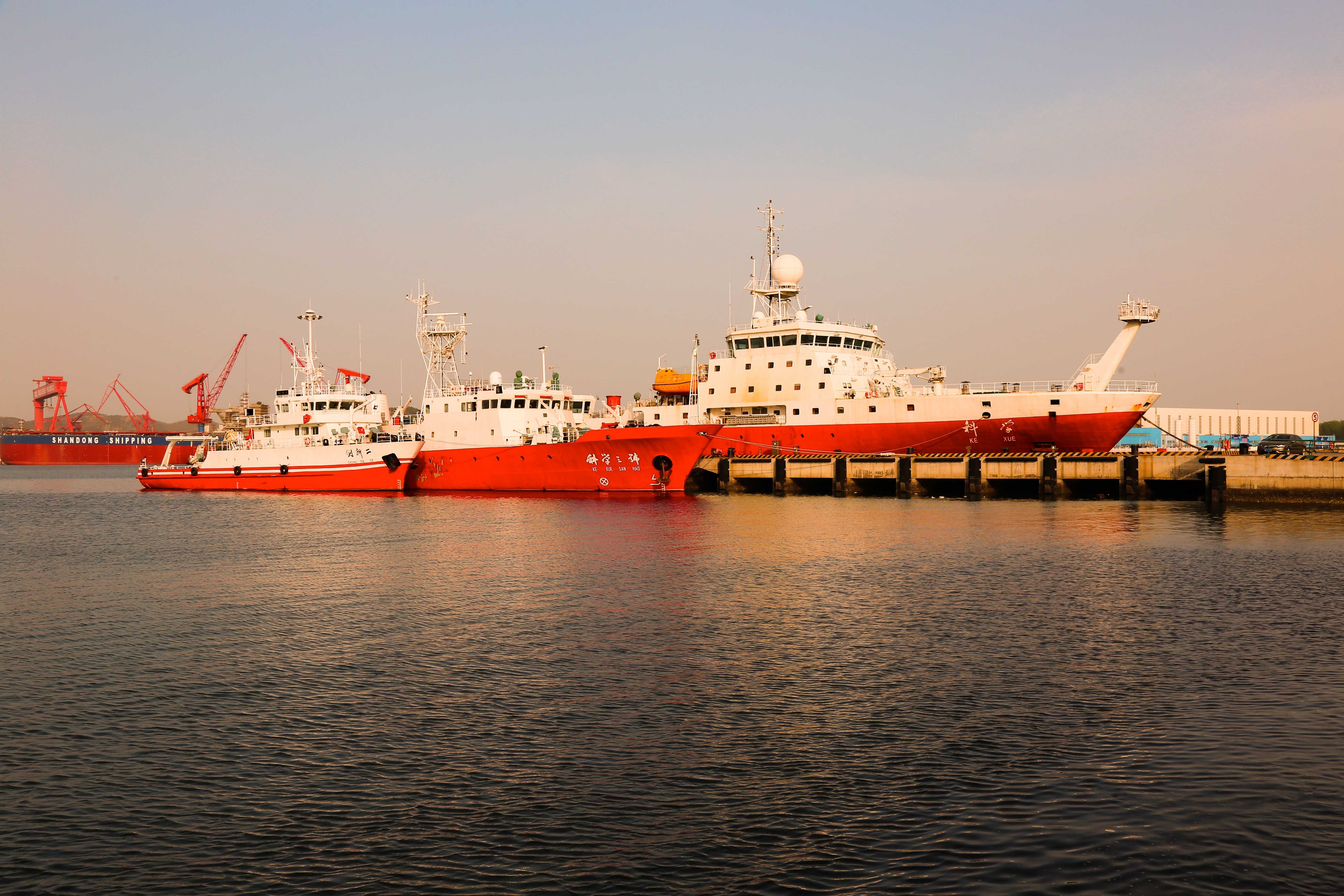 夕阳下中科院海洋所“科学”号、“科学三号”和“创新二号”三艘海洋科学综合考察船齐聚停靠母港的画面,展示海洋所科考船的崭新风貌和雄厚实力,为我国海洋科学和技术的发展提供了重要支撑。夕阳下,各艘科考船在海中形成的倒影,魅力无限,衬托出船舶??磕父鄣哪仓馈?/p>