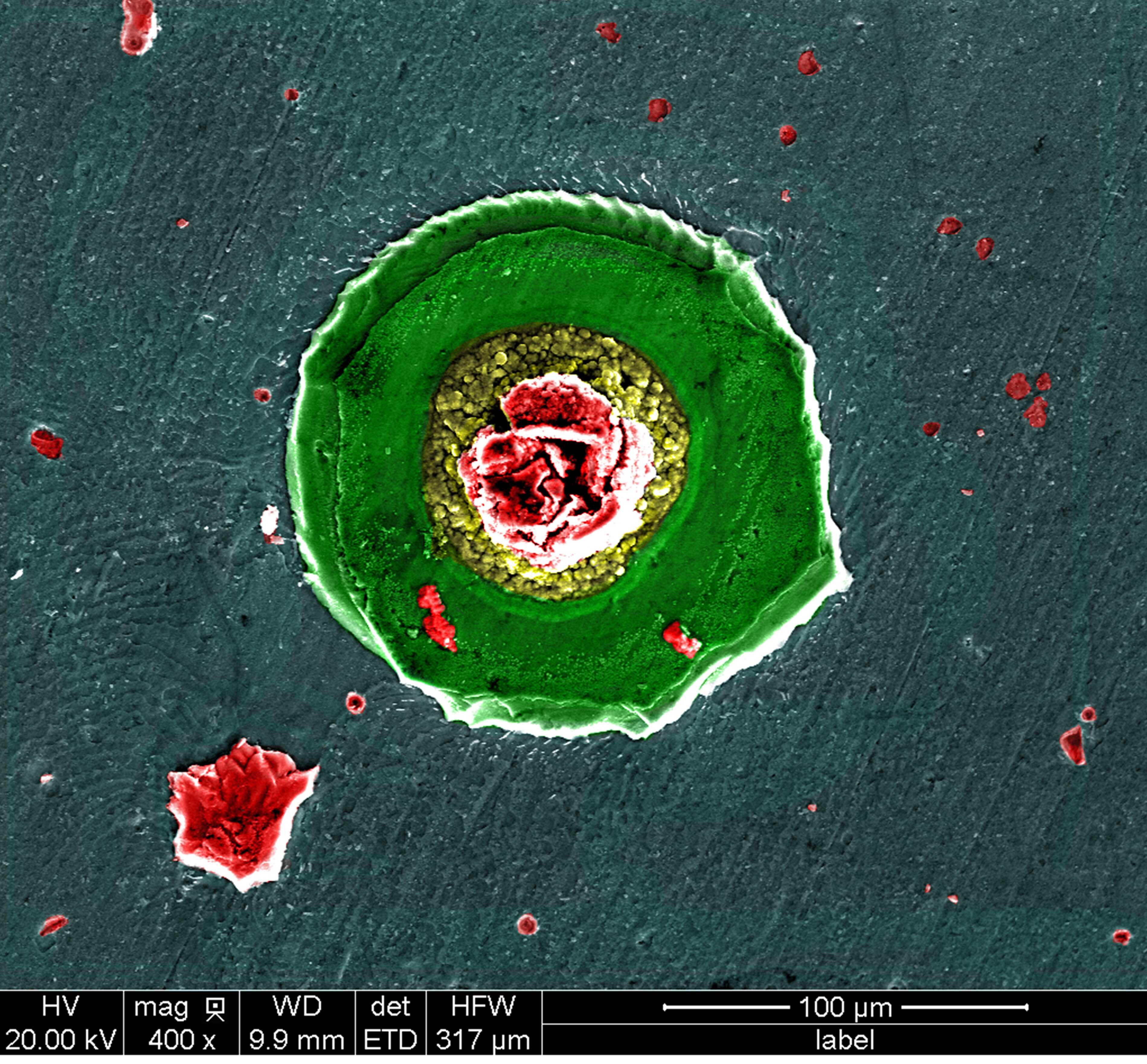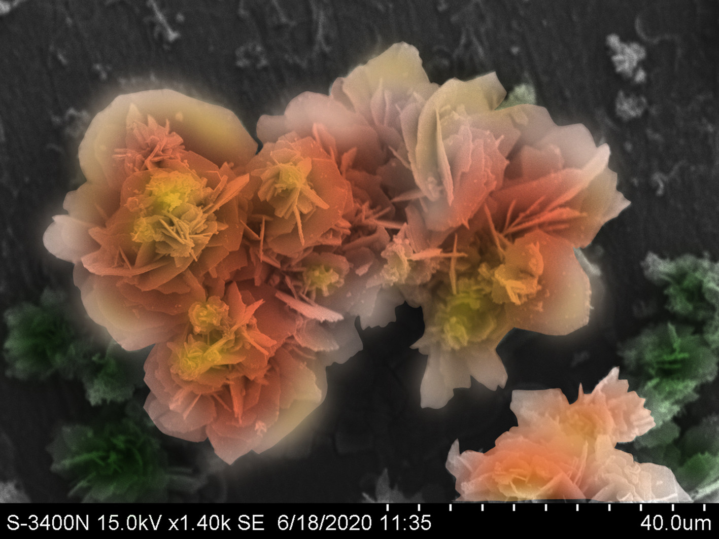 将Q235碳钢浸泡在3.5%NaCl+少量缓蚀剂溶液里,得到铁的腐蚀产物,在电子显微镜中放大1400倍拍摄碳钢表面腐蚀后的形貌。表达出铮铮铁骨也有柔情似水的一面,有了水的滋润,氧气的帮助,铁块上便能绽放出最美的花朵。