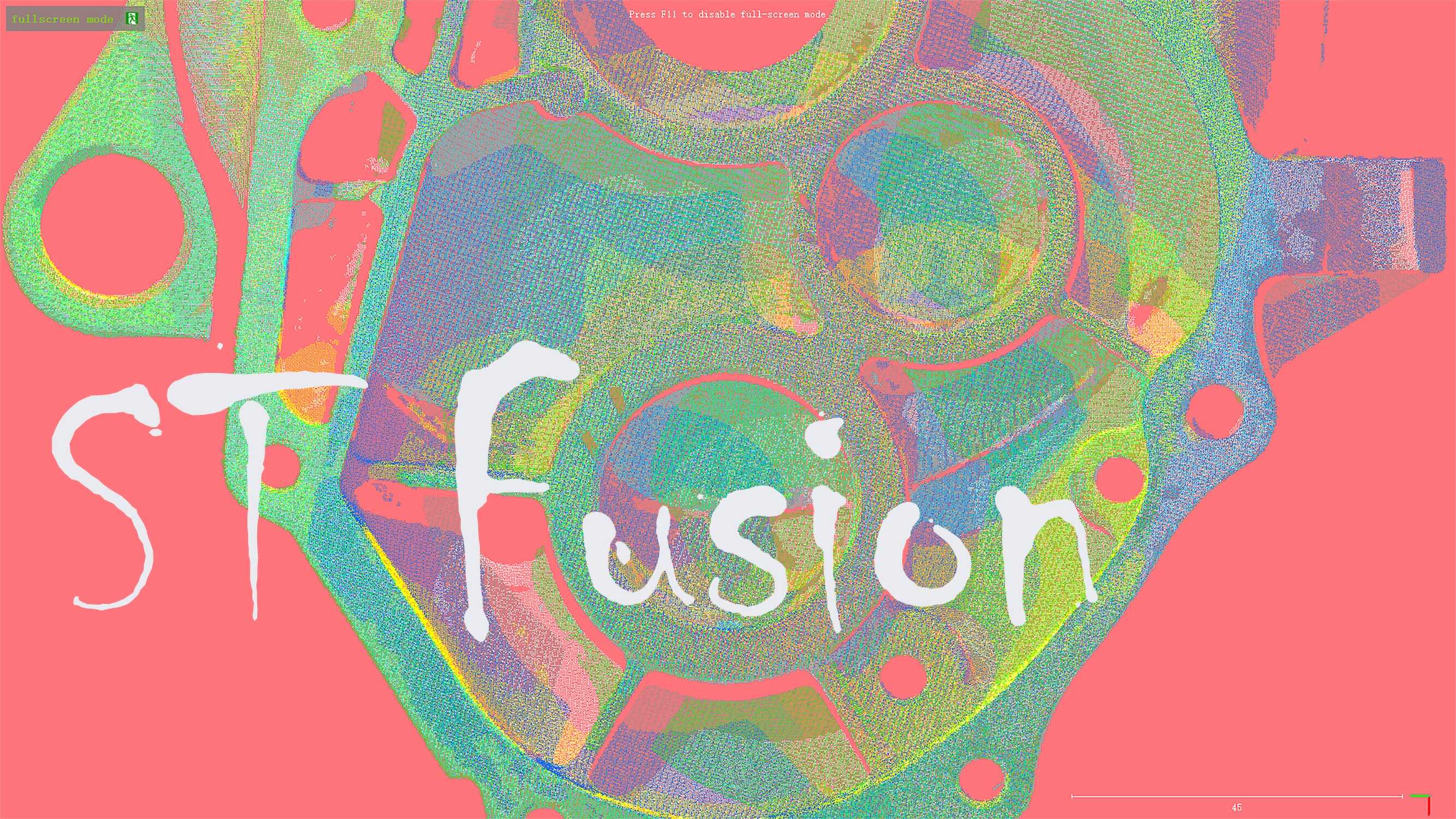 使用搭建的多投影仪结构光系统对发动机的HDR表面多角度扫描,使用补偿算法实现了三维表面的鲁棒重建和多点云无特征无迭代的精确配准,通过点云融合的色彩斑斓体现现代平面设计艺术。