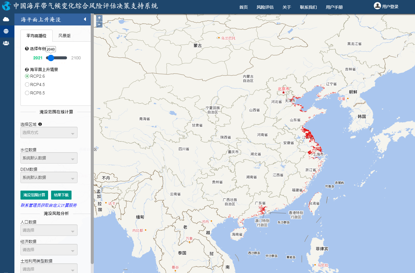 本系统旨在增进海岸带气候变化风险评估和决策等方面的科学研究和学术交流,促进科学认知水平的提升,从而为我国沿海地区加强气候变化风险应对、提升沿海地区韧性水平、促进海岸带区域可持续发展等提供支持。