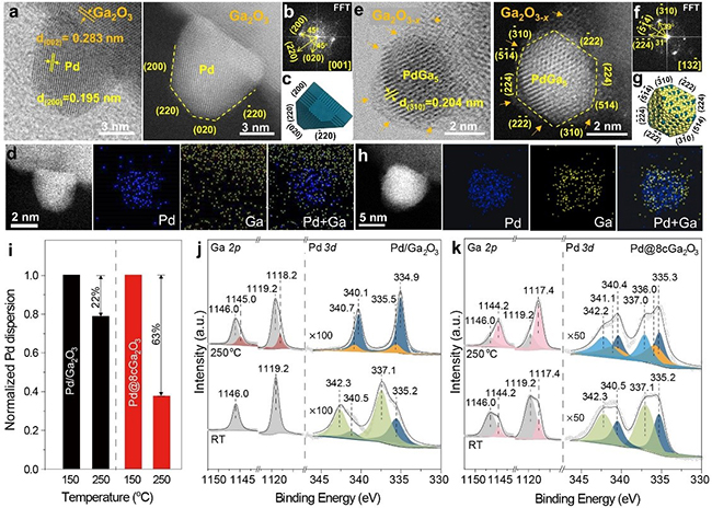 本工作采用基于STEM-XPS-XRD联用的(准)原位表征方法,原位监测了原子级厚度Ga2O3包裹的Pd/Al2O3倒置型催化剂(Pd@8cGa2O3)和负载型Pd/Ga2O3催化剂的金属—载体合金化过程。结果表明,在250 低温还原过程中, Pd@8cGa2O3由于界面增强效应促进了低温合金化,形成PdGa5和PdGa等富Ga合金相,明显区别于传统负载型Pd/Ga2O3催化剂;而后者在400 以上才能发生RMSI,根据合金相图,此时生成高温稳定的Pd2Ga相更为有利。在250 和4.5MPa的CO2加氢测试中,Pd@8cGa2O3的产物收率达到26960gMeOH+DMEkgPd-1h-1,远高于Pd/Ga2O3和Pd/Al2O3。漫反射红外光谱(DRIFTS)进一步揭示富Ga合金相对甲酸根中间体的生成和消耗速度更快,副产物CO的脱附受到抑制,从而有利于甲醇、二甲醚等含氧化合物的生成。