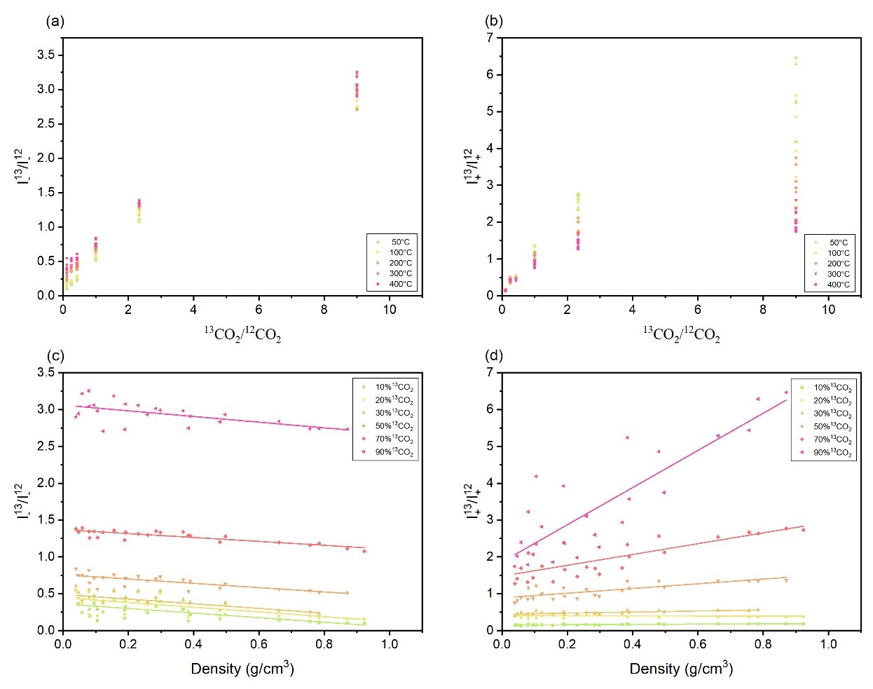 针对这一问题,张鑫团队利用构建的高温高压实验显微模拟装置,系统地研究了50-450 ,50-400 bar下高纯13CO2、12CO2的拉曼光谱,对比了两者峰位、峰宽随温度、压力的变化(图2)。在实验温压范围内,13CO2和12CO2的特征峰的半峰宽均在2-5 cm-1,而两者的峰位差却可达15 cm-1以上,表明两者在拉曼光谱中可以很好地通过特征峰的峰位进行区分。进一步地,研究团队通过对不同比例的混合气的研究,探讨了不同温度、压力下 13CO2和12CO2的拉曼特征峰的峰强比、面积比与两者含量比的关系,并最终分别选取I+13/I+12、I-13/I-12为定量指标建立起了可用于高温高压体系下CO2碳同位素组成(13CO2/12CO2)测定的拉曼定量校准模型(图3)。该定量方法的建立,为原位快速监测同位素标记的实验体系提供了有效检测手段,并有望应用于流体包裹体及深海热液流体中CO2碳同位素的原位测试。