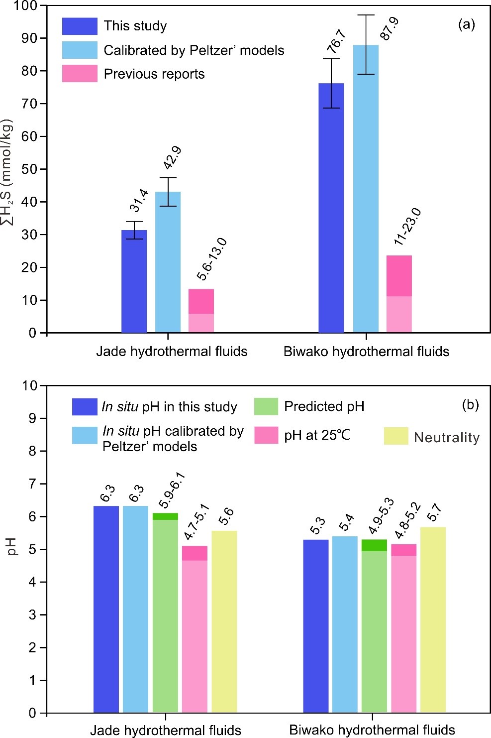 碱性热液系统被认为是地球生命起源的理想场所,在深海研究中备受关注,因为碱性热液环境可以为地球早期生命的形成提供理想的离子梯度条件,有利于化学渗透的进行,但是目前碱性热液喷口仅发现于大西洋的Lost City热液区[2]?;『笕纫合低车募疃冉细?,其流体的pH值明显高于洋中脊的热液流体,那么在高温喷口环境下,弧后热液流体的原位pH是否会超过中性流体的界限,呈现碱性流体特征呢?