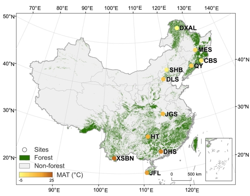 针对上述问题,中国科学院沈阳应用生态研究所方运霆研究员团队与中国科学院地理科学与资源研究所张扬建团队等建立了15N标记量化土壤N2O和N2产生速率的技术,对中国18个森林土壤反硝化作用N2O和N2产生速率的温度敏感性进行了研究,探讨了主要驱动因素,并利用生态系统过程模型(DyN-LPJ)结合室内培养的温度敏感性结果模拟了未来变暖情形下全球森林土壤反硝化作用气态氮释放的响应。研究的18个森林站点从南到北相距4000km,纬度相差33 (图1),覆盖了广泛的气候梯度(年均温相差25 C,年降水量相差2000mm)。