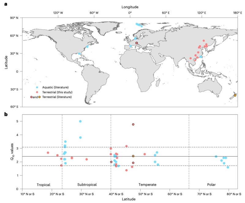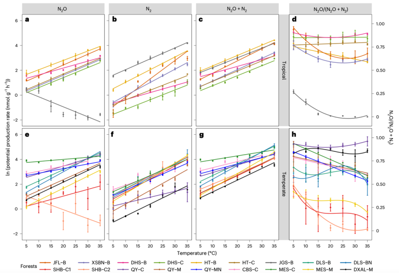 这项研究成果以“Universal temperature sensitivity of denitrification nitrogen losses in forest soils”为题于2023年6月22日发表在Nature Climate Change上(IF2021=28.66)。中国科学院沈阳应用生态研究所于浩明博士生为第一作者,方运霆研究员和中国科学院地理科学与资源研究所张扬建研究员为共同通讯作者。合作者还有挪威生命科学大学Jan Mulder教授和Peter Dorsch教授、美国纽约州立大学朱伟兴教授、中国科学院青藏高原研究所旭日研究员等。该研究受到国家重点研发计划(2016YFA0600802)和中国科学院卢嘉锡国际团队项目(GJTD-2018-07)等项目资助。