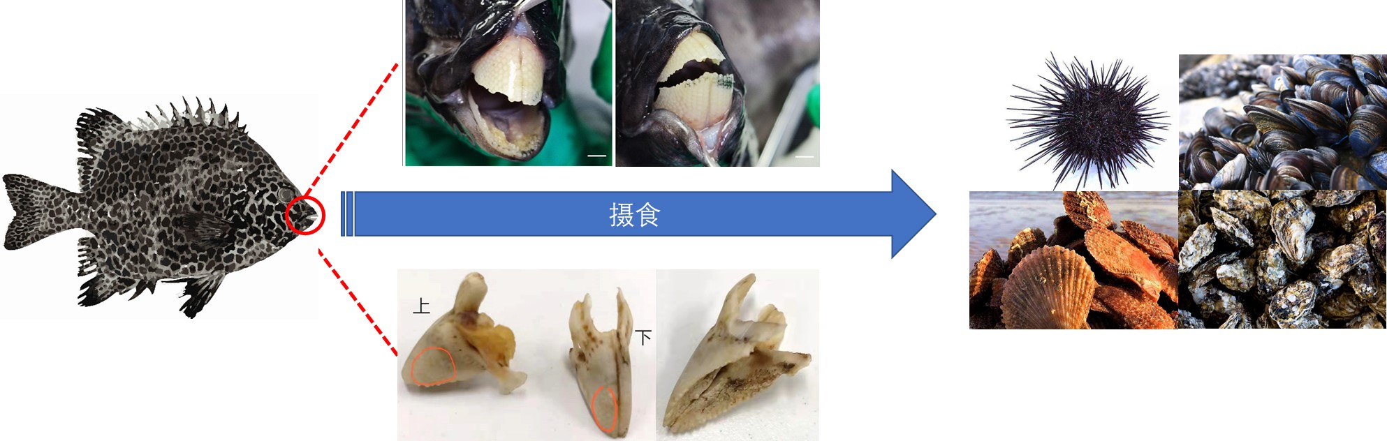 斑石鲷(Oplegnathus punctatus)是我国近年来新开发的重要海水养殖经济鱼种,具有典型的愈合型喙状齿表型,可摄食牡蛎、海胆等硬壳类食物。海洋所李军研究团队在国内率先突破了斑石鲷全人工繁育技术,建立了苗种规模化生产技术(100万尾/年)及工厂化封闭循环水养殖与网箱养殖相耦合的陆海接力养殖模式,极大地扩大了斑石鲷养殖规模。