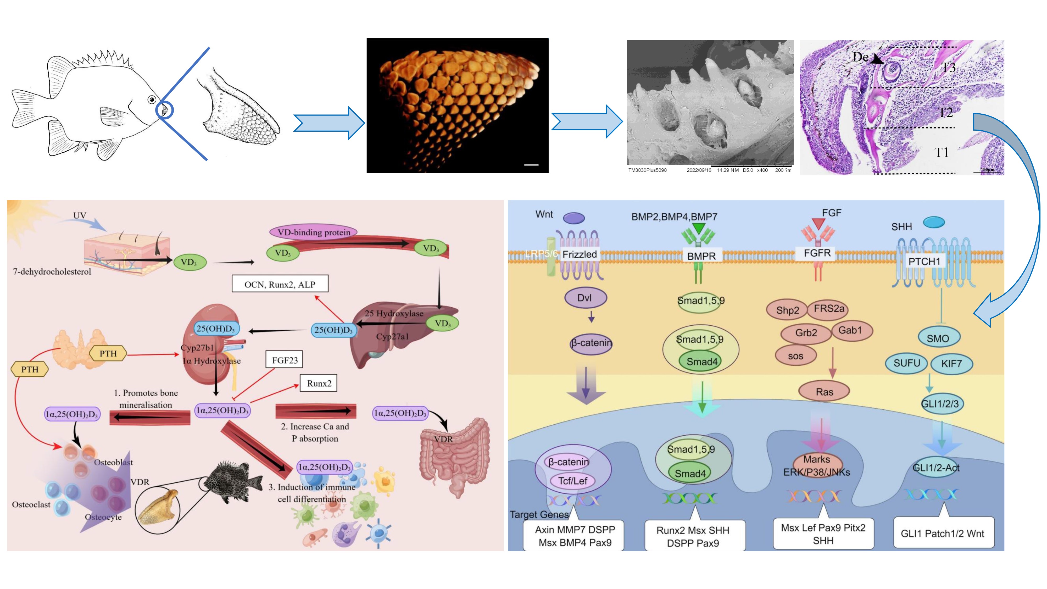 科研人员综合采用形态解剖、扫描电镜以及microCT 3D扫描成像等技术多角度系统研究了斑石鲷愈合型喙状齿的发生发育特征,首次发现斑石鲷的愈合齿呈“嵌套”排布模式,颌齿齿式(4,15-16,10-1);确定了喙状齿的早期发生发育关键时间节点(28dph初代齿萌发;40dph替换齿出现,颌齿开始愈合;45dph开始硬骨化;50dph喙状愈合齿完成)(图2)。此外,基于基因组学和转录组学等多组学联合分析,获得了11个(bmp2、bmpr2、smad1、wnt5a、msx、axin2、fgfr1a、fgfr2、pitx2、ptch1、cyp27a1)与斑石鲷喙状齿的发育密切相关的关键基因及关键调控通路(Wnt、BMP、FGF、SHH),在斑石鲷颌齿愈合前、愈合中和愈合后协同调控颌齿上皮与间充质相互作用,促进成釉细胞及成牙本质细胞的持续增殖和分化(图3)。此外,研究还发现Vd代谢及钙积累密切相关的cyp27a1基因定位于斑石鲷上颌骨及颌齿基部,且在颌齿快速愈合期加速表达,促进维生素D代谢,进而调控斑石鲷颌齿牙胚内细胞分化以及牙釉质和牙本质矿化,为喙状齿的愈合和发育提供钙质基础。该研究丰富了鱼类牙齿发生发育理论及调控机制研究,为更好地理解生物颌齿的适应性进化和再生能力提供了新的见解。