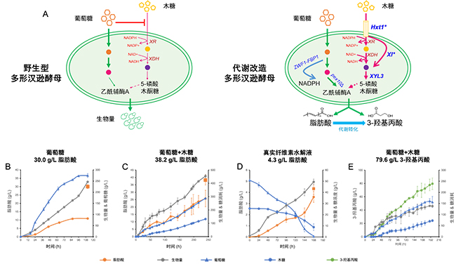 多形汉逊酵母具有天然木糖代谢、耐高温以及高密度发酵等优势,有望成为木质纤维素生物炼制的优良宿主。本工作中,研究团队通过强化木糖同化与转运效率,在不牺牲葡萄糖利用的前提下,实现了葡萄糖与木糖同步利用,在葡萄糖与木糖模拟物料中,脂肪酸产量达到38.2g/L;在真实木质纤维素水解液中,脂肪酸产量达到7.0g/L;最终,借助代谢转换策略,团队将脂肪酸合成菌株转化为3-羟基丙酸合成菌株,获得了79.6g/L的3-羟基丙酸,为木质纤维素生物炼制提供了新型高效的微生物平台。研究团队在前期改造多形汉逊酵母中,还实现了甲醇生物转化高效合成脂肪酸(Nat. Metab.,2022)。这些工作有望为可再生原料生物转化合成高附加值化学品奠定基础。