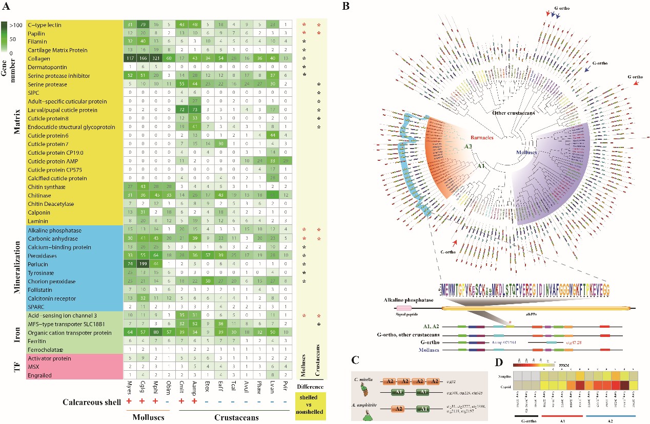 鉴于蔓足类和贝类等软体动物具有极为相似的生物学表征,如钙质化外壳和附着生长生活方式,研究人员开展了蔓足类和贝类全基因范围趋同进化的研究。比较基因组学分析发现蔓足类和贝类中大量钙质化外壳形成相关基因家族呈现趋同的扩张现象,包括两类生物矿化关键基因:碱性磷酸酶(ALP)和碳酸酐酶(CA),以及部分基质蛋白基因和离子运输基因。这些基因的扩张均分别发生于蔓足类和贝类生物的祖先基因组上,与生物矿化的生物学机制形成时期(寒武纪)接近,揭示了两个类群的钙质化外壳可能起源于同一时期,而关键基因的新功能化促进了新表型的产生。与钙质化外壳形成不同,蔓足类和贝类附着生活方式的起源与新基因的产生有关。蔓足类显著扩张的表皮蛋白可能是其独特的一类基质蛋白,揭示其钙质化外壳可能起源于其几丁质表皮系统。
