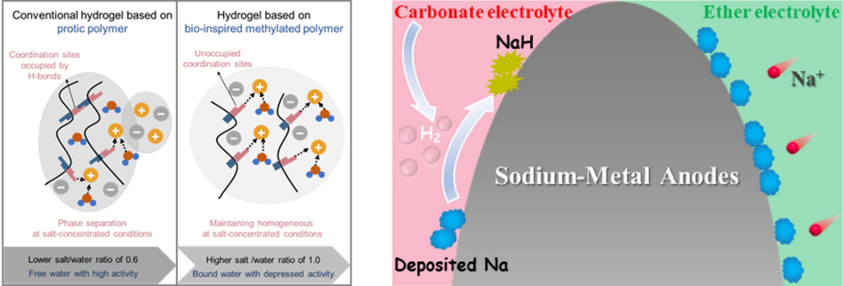 近期,固态能源系统技术中心在低成本钠离子电池领域再获重要进展,研究成果相继发表在国际权威期刊《Angew. Chem. Int. Ed.》、《Adv. Energy Mater.》和《Energy Storage Mater.》上(图1)。针对传统水系电解质中的自由水分子导致析氢、电极金属离子溶出等问题,研究团队通过甲基化调节氢键作用获得了钠离子电池超高浓聚合物电解质新体系,钠电池的循环稳定性实现突破性提高(Angew. Chem. Int. Ed. 2023, e202311589)。同时,研究团队发现钠金属负极SEI中NaH是影响电池性能的主要因素,是导致钠电池失效的一种重要机制,NaH是由电池循环中产生的氢气和已沉积的金属钠自发反应生成的(Energy Storage Mater. 2023, 61, 102891)。研究团队针对当前钠离子电池电解质领域,进一步总结了当前钠离子电池电解质中的基础原理和研究进展,并对电解质未来发展方向进行了展望(Adv. Energy Mater. 2023, 2301758)。