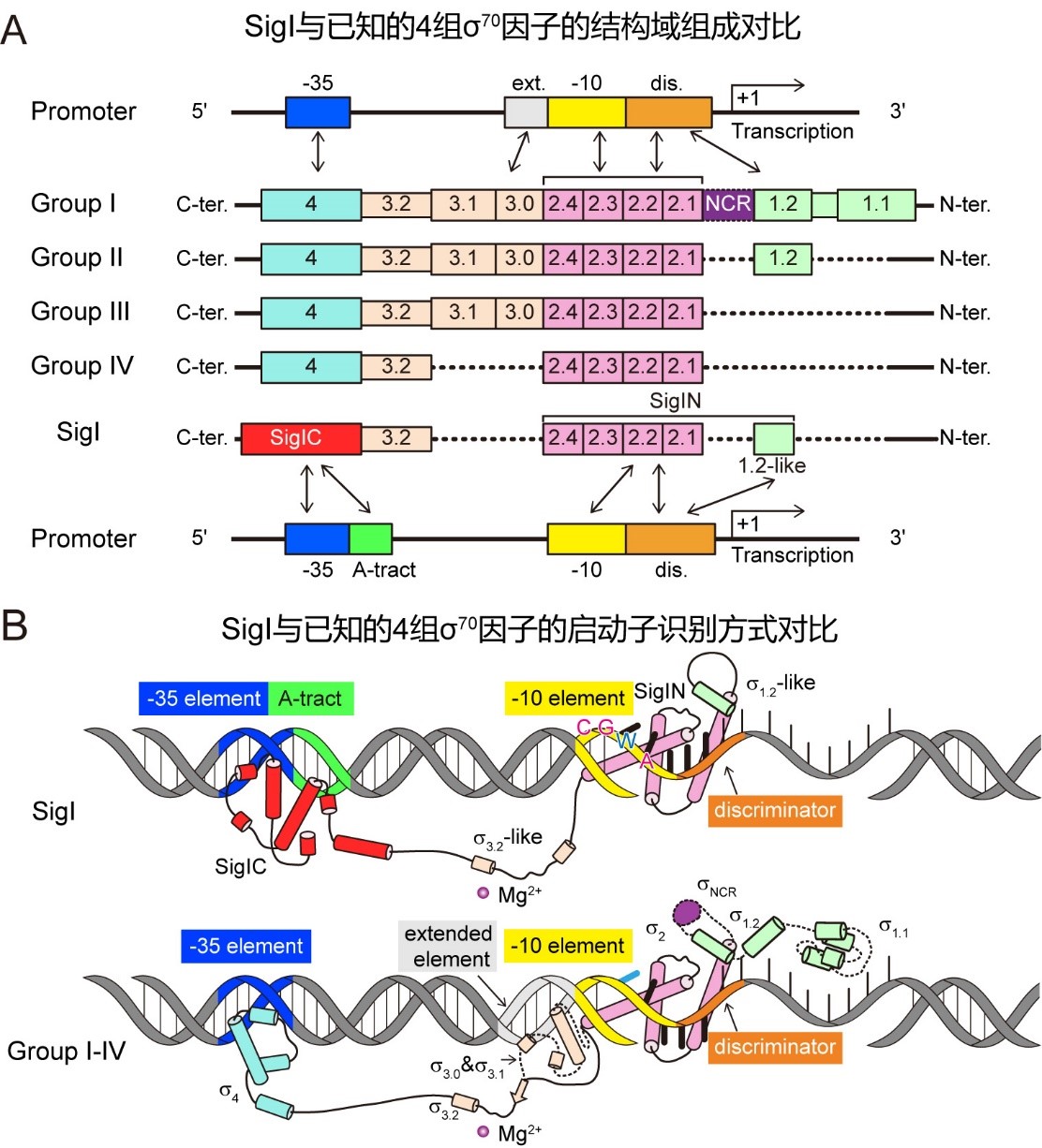图2 SigI因子具有和已知的4组 70家族 因子不同的结构域组成和启动子识别方式。