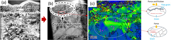 图3.(a)凹痕诱发表面裂纹萌生机制;(b)超高循环周次下表面微塑性变形机制