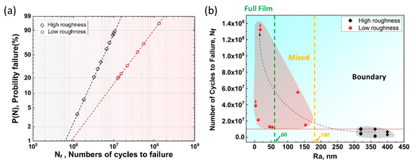 图2.(a)两种粗糙度等级下疲劳寿命的威布尔分布;(b)疲劳寿命随粗糙度Ra的变化