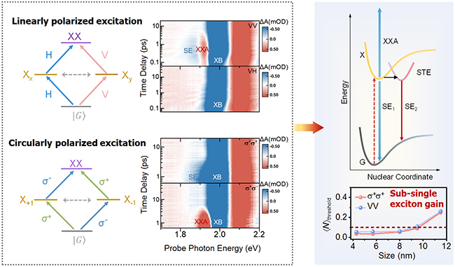 研究团队前期研制了偏振选控的飞秒瞬态吸收光谱,在此基础上揭示了量子点激子自旋拍频新机制(Nat. Mater.,2022),以及实现了室温下的量子点自旋相干操控(Nat. Nanotechnol., 2023)。在本工作中,团队基于该谱学方法清晰地在单激子漂白(XB)信号的红端位置分辨出受激辐射(SE)和单激子态到双激子态吸收(XXA)信号特征?;诩ぷ悠裉匦苑治觯哦臃⑾諧sPbI3和CsPbBr3钙钛矿量子点的受激辐射都包含一个高能组分和一个低能组分,即一个较小Stokes位移的带边自由激子发射(SE1)和一个较大Stokes位移的瞬时自陷激子发射(SE2)。研究发现,当泵浦—探测脉冲光保持相同圆偏振时,双激子吸收被抑制,这两种发射的斯托克斯位移都足够克服非均匀激子线宽,从而实现平均激子数小于0.1的增益阈值;当泵浦—探测脉冲光保持相同线偏振时,双激子吸收会覆盖带边自由激子的受激辐射(SE1),但是自陷激子的受激辐射(SE2)的Stokes位移仍然足以克服双激子吸收并实现类似的低阈值光增益。该低阈值光增益现象在不同尺寸的CsPbI3和CsPbBr3量子点中均能被观测到。