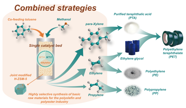 本工作通过组合调控策略,对产物烯烃、芳烃选择性进行同时调控,实现了在单一分子筛床层上高选择性生产乙烯、丙烯、对二甲苯等高附加值产品。其中乙烯、丙烯可以进一步生产聚乙烯(PE)、聚丙烯(PP),而乙烯下游产物乙二醇(EG)和对二甲苯下游产物精对苯二甲酸(PTA)可以进一步生产聚酯(PET)。这种高效的耦合路线对聚烯烃和聚酯工业的原料合成具有重要的指导意义,同时组合调控策略的建立为复杂催化过程中多种目标化学品的联合生产提供了模型案例,基于此策略的甲醇耦合工业示范装置正在建设中,将有望在大规模的甲醇耦合工业过程中得到推广和应用。