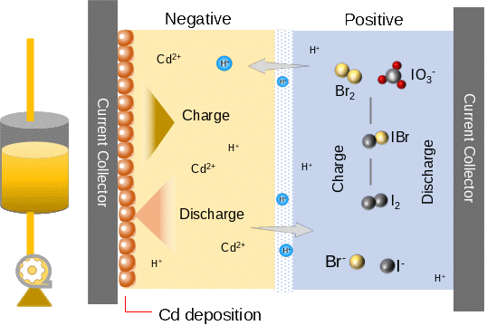 为了提高水系电池的能量密度,本工作中,李先锋团队使用碘离子(I-)和溴离子(Br-)混合卤素溶液作为电解液,构建了碘离子(I-)到碘单质(I2)进而到碘酸根(IO3-)的多电子转移反应。充电过程中,碘离子在正极生成碘酸根,伴随生成的氢离子从正极传导到负极一侧;放电过程中,氢离子从负极向正极传导,碘酸根被还原为碘离子。团队利用在充放电过程中形成的溴化物中间态,优化了反应路径,有效提高了电化学反应的活性和可逆性,所开发的多电子转移正极比容量达 840安时/升。该正极与金属镉组成全电池,基于正极侧的能量密度超过1200瓦时/升。