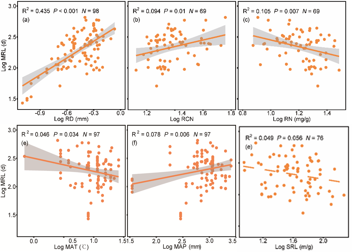 尽管吸收根(1-3级根)的生物量较低(仅占根系生物量的4%左右),却主导着整株树木根系的产量和周转。通过整合全球其它站点利用微根管技术监测吸收根的数据,发现全球森林树木吸收根的平均寿命是226天,其中最短的是27天,最长的是656天。细根寿命的最佳预测模型参数包括细根直径、细根氮浓度、年均温度及降水量,预测解释度为47%。吸收根的寿命随氮含量的增加而减少,随直径的增加而显著增加,特别是在年均温度较低、降水较多的地点,细根具有较长的寿命(图1)。此外,除常绿树种外,细根寿命和叶片寿命不相关,这表明细根和叶片具有不同的进化选择和周转策略以适应地上和地下不同的环境条件。吸收根(1-3级根)由于具有较高的产量和周转速率,然而衰老和死亡以后,分解速率却较低(图2),因此该根系??槎陨滞寥捞嫉墓毕卓赡芫邮孜弧R劳懈醚芯客缂嗖獾氖?,初步估算吸收根输入对森林土壤碳库的贡献可占整株林木根系的75%以上。