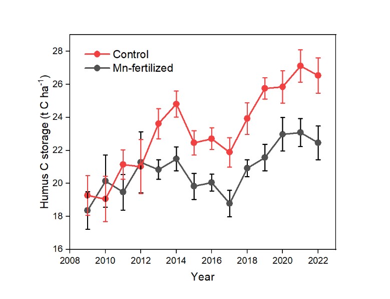 研究揭示了外生菌根真菌通过调控土壤锰元素循环促进了落叶松人工林腐殖质层碳库积累的新机制。北方森林(Boreal forests)储存了全球陆地生态系统24%以上的碳库,其中大约64%储存于地下。其储存的碳库主要位于腐殖质层中,包含正在分解的凋落物和其它有机物质。Agaricomycetes是高纬度地区落叶松人工林土壤中普通存在的一类外生菌根真菌,Agaricomycetes特异性产生的锰过氧化物酶通过驱动锰氧化还原循环,可以把腐殖质层中可利用的二价锰离子(Mn2+)转化为活性三价锰离子(Mn3+),该活性三价锰离子与真菌分泌的草酸类螯合剂形成化合物,可穿透木质素和木质素类化合物的酚类结构,从而调控有机质分解和腐殖质层碳库积累。基于此假设,研究团队在大兴安岭寒温带落叶松人工林设置了长达14年的锰添加实验(图3),发现锰添加处理进行到第5年后,显著改变了外生菌根真菌的群落组成并增加了腐殖层碳库容量。本研究解析到的锰添加的滞后影响,可能是由于外生菌根真菌需要一定周期后才能适应锰有效性的增加和土壤环境的变化。