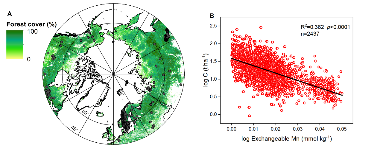 对我国大兴安岭落叶松人工林318个样点腐殖层碳库的调查研究,也表明腐殖质层可交换态锰含量是调控碳库的重要调控因子(r2=0.20)。同时,结合瑞典国家森林土壤清查、瑞典国家森林清查数据以及数据整合分析的手段,建立了覆盖全球北方森林范围的2437个样点的腐殖质层碳储量数据,发现可交换态锰含量可以解释北方森林腐殖层碳库36%的变化(图4)。研究结果与长期锰添加实验相互验证和补充。