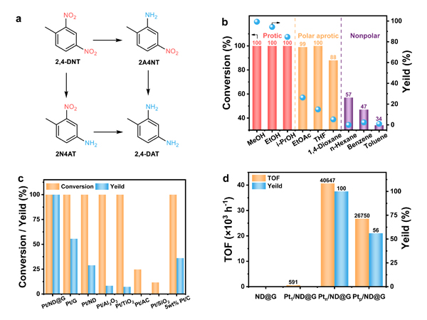图2.?催化剂性能测试。a 2,4-DNT加氢路径,b反应溶剂考察,c不同载体性能对比,d不同结构Pt催化剂TOF和催化性能的关系。