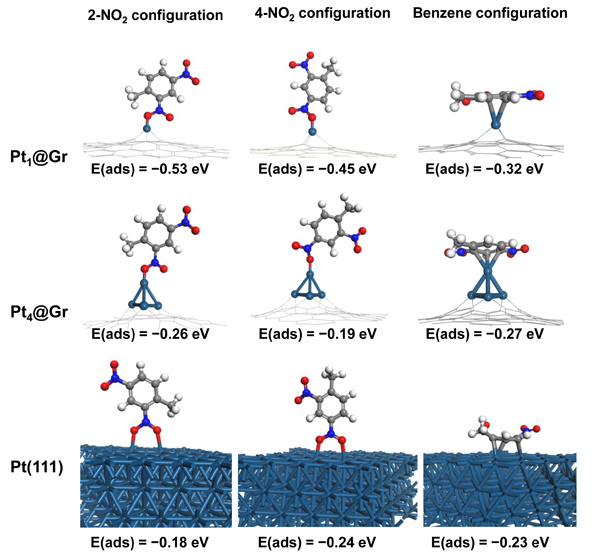图3. DFT计算。2,4-DNT在Pt1@Gr、Pt4@Gr和Pt(111)上三种可能的吸附模式(2-NO2-构型、4-NO2-构型和benzene-构型)以及对应的吸附能。