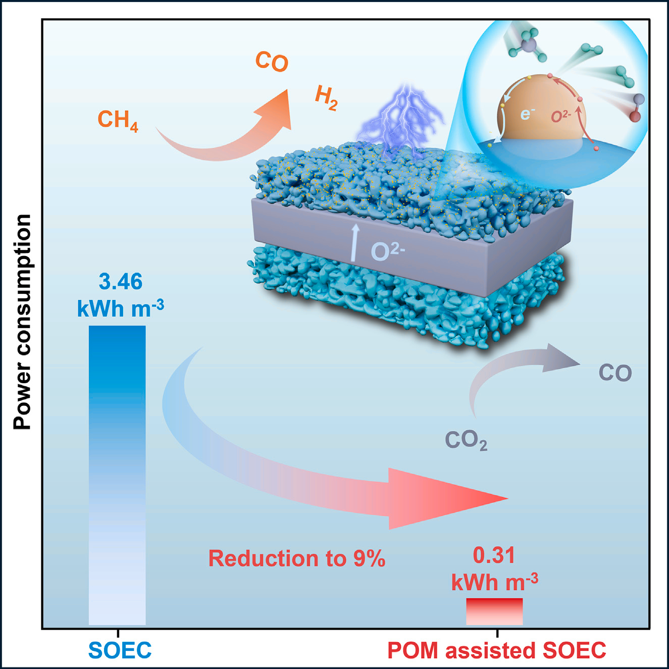该团队长期致力于基于固体氧化物电解池的高温电催化研究,前期利用原位溶出和高温分散法开发出了一系列高活性电化学表界面,用于高温电极反应。本工作中,团队通过调控La0.6Sr0.4Ti0.3Fe0.7-xCoxO3- 阳极钙钛矿中B位Co\Fe比例,优化B位过渡金属溶出能,实现在La0.6Sr0.4Ti0.3Fe0.5Co0.2O3- (LSTFC2)钙钛矿表面原位溶出生成平均粒径最小为7nm、颗粒密度最高为1087个 m-2的CoFe合金纳米颗粒,为阳极CH4转化提供了充足活性位点。研究还发现,电驱动产生的溢流氧也可进一步促进甲烷吸附活化、抑制积碳形成,从而提升了阳极催化剂活性和稳定性。800 C下,LSTFC2阳极CH4转化率可达到86.9%,CO选择性达到90.1%,连续稳定运行1250 小时无显著衰减。电化学性能测试表明,阳极引入甲烷半氧化重整反应后,CO生产能耗从传统SOEC的3.46 kWh/m3降低到0.31 kWh/m3。本工作为C1小分子升级转化提供了新的研究思路。