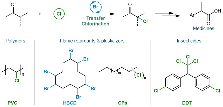 陈庆安团队一直致力于发展不同催化体系,以实现简单原料的高值化利用。在前期相关研究(Angew. Chem. Int. Ed.,2021;Nat. Chem.,2022;Nat. Catal.,2022)的基础上,团队最近开发出一种烷基溴催化的氯转移反应,利用该反应不仅可以合成具有高附加值的 -氯代酮,还能够实现烯烃的氯羟基化。此外,该团队还进行一系列对照实验和动力学研究,发现该反应是通过卤素交换来实现不同分子间氯的转移。在机理的指导下,该团队利用溴代有机污染物六溴环十二烷(HBCD)实现了酮和芳烃的溴代。随后,为了进一步验证该反应的实用性,该团队将氯转移反应应用到氯代有机污染物的再利用上。研究发现,常见的氯代有机污染物氯化石蜡(CPS)、滴滴涕(DDT)、氯甲基化聚苯乙烯(CMPS)、以及聚氯乙烯(PVC)均能够作为转移氯化反应的氯源。团队直接利用HBCD作为催化剂,PVC作为氯源,快速地合成 -氯代酮,再经过简单的转化,实现了非甾体抗炎药萘普生、布洛芬和非罗考昔的合成。研究还发现,废弃的PVC塑料同样能够作为氯源来合成氯代产物,尽管这些废弃塑料中含有大量的塑化剂,但是对氯化反应并没有明显的影响。因此,该反应在卤代有机污染物的再利用上具有很好的应用前景。