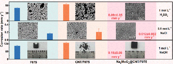 图2. 高强高耐蚀7075铝基复合材料优异的耐强酸性、中性和强碱性介质腐蚀性能