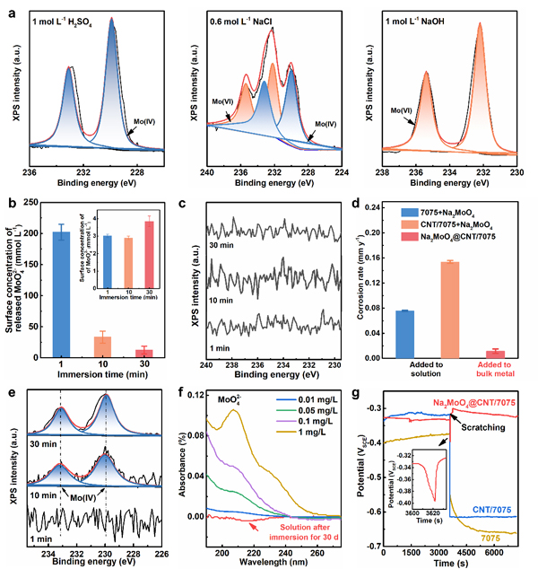 受鱼类在受到外部刺激时会通过腺体自发分泌粘液来进行自我?;さ淖匀幌窒笃舴?,王政彬提出了“内生沉淀剂为粘液,中空碳纳米管为腺体,毛细作用为分泌驱动力”的仿生设计策略,成功制备出高强高耐蚀的块体7075铝基复合材料,抗拉强度高达~700 MPa,耐晶间腐蚀、剥落腐蚀和应力腐蚀性能优异,其强度和耐蚀性的综合匹配超过了目前公开报道的其他铝合金(图1)。该材料在酸、碱、盐环境中均具有极低的腐蚀速率(图2),在强腐蚀性碱性介质中的腐蚀速率甚至比最耐蚀的纯铝还低133倍。优异的耐蚀性主要是因为毛细作用诱导沉淀剂自发从碳纳米管中溶出并在表面富集,形成?;ば阅げ悖ㄍ?)。运用上述仿生策略同样研制出了兼具高强高耐蚀的2024以及6061铝基复合材料,表明该策略具有可拓展性,有望能研发出其他高强高耐蚀金属材料。