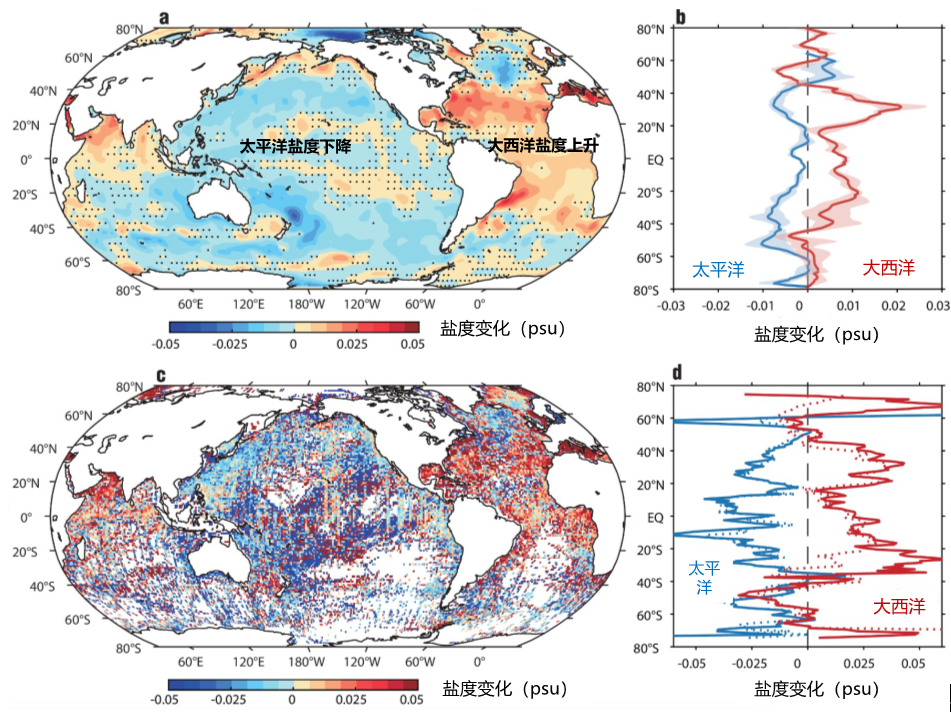 近日,中国科学院海洋研究所王凡团队联合中国科学院大气物理研究所研究团队在《自然-气候变化》期刊(Nature Climate Change,最新影响因子29.6)发表了题为“North Atlantic-Pacific salinity contrast enhanced by winds and ocean warming”的研究论文。该研究定量揭示了上世纪中叶以来大西洋-太平洋盐度差异(APSC)的加强趋势及其空间结构,阐明了风生海洋环流变异和水团源地迁移对盐度变化的重要作用,并指出当前气候模式对盐度变化模拟的普遍偏差及其成因,对改进气候模式、提高气候预测水平具有参考价值。