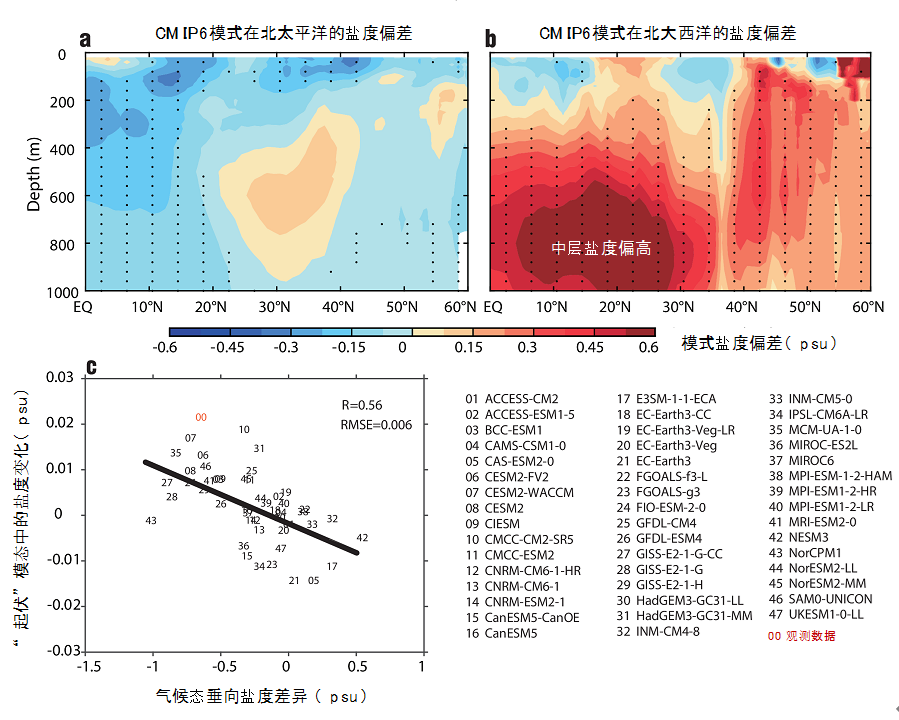 以往对盐度变化的研究普遍强调表面淡水通量(即降水和蒸发)的控制作用,并将海洋盐度视为全球淡水循环变化的指示物。本研究通过热力学模态分解(即分离“起伏”模态和“涩变”模态)和LICOM3模式敏感性试验,检验了各种物理过程对盐度长期变化的贡献。结果显示,除了降水和蒸发之外,风场和海洋增暖也对大尺度盐度变化趋势具有重要作用。其中,风场的长期变化导致风生海洋环流变异,海洋表层变暖则导致水团的形成源地向高纬度迁移,这些过程显著改变了盐分在海洋中的空间分布,即“盐度再分配”作用,从而在APSC加强趋势及其经向结构的形成中发挥了关键作用。上述过程在大西洋和太平洋均有发生,但由于两大洋气候态盐度分布(如水平和垂向盐度梯度)的差异,产生了截然不同的作用结果。当前气候模式(CMIP6)在盐度变化的模拟中仍存在明显偏差,普遍低估了大西洋盐度的上升趋势,这与模式对气候态盐度分布的模拟偏差有关(图2)。大多数CMIP6模式模拟的大西洋表层盐度偏低,中层盐度偏高,因此严重低估了垂向盐度梯度。这使得模式中海洋动力过程的盐度再分配作用偏弱,因此低估了大西洋盐度的升高趋势。