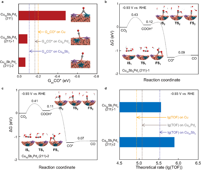 本工作中,肖建平团队探究了单原子合金催化剂Cu92Sb5Pd3电催化CO2还原表现出高CO选择性的原因。研究发现,Pd和Sb单原子的共掺杂作用,降低了Cu基催化剂的表面能,提高了Cu基催化剂稳定性;改变了电荷分布,降低了d-band 中心,减弱了CO*的吸附,提升了CO的选择性。通过电荷外插值法,肖建平团队计算了工作电势下的CO2还原反应的反应能垒,并通过微观动力学模拟得到了CO*覆盖度、CO法拉第效率,模拟结果与实验结果有较好的吻合。该研究为设计高活性和特定选择性电催化材料提供了新思路。