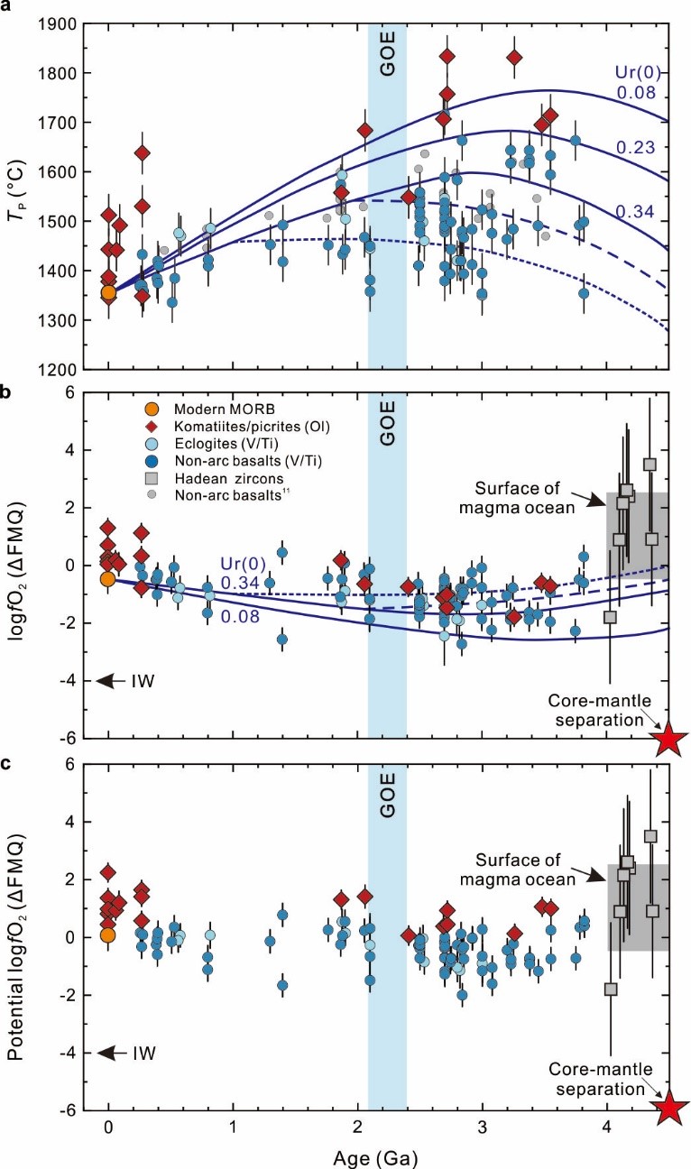 图 1. 幔源岩浆的热状态和氧化还原状态长期演化历史