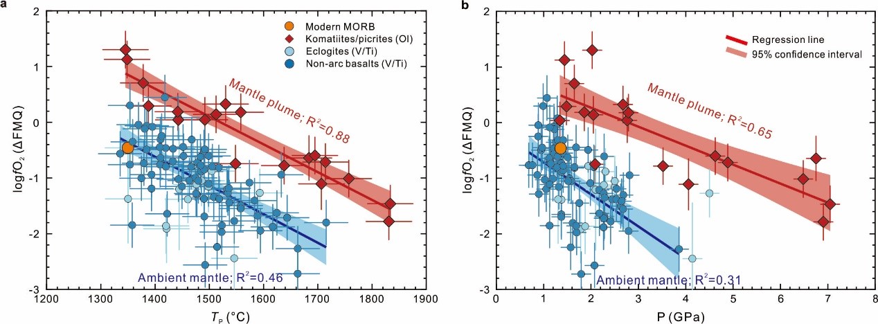 图2. 幔源岩浆的氧逸度与地幔潜能温度和部分熔融压力之间的相关性