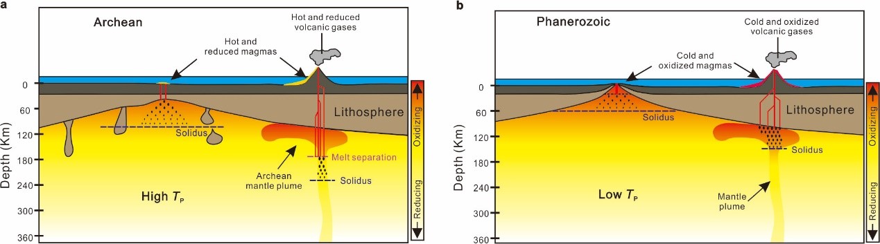 (a)太古宙高温的地幔诱发了深部地幔发生高程度的部分熔融,造成该时期的幔源岩浆具有较低的氧逸度;(b)太古宙之后,随着地幔潜能温度的降低,地幔熔融深度逐渐降低,形成了较为氧化的熔体