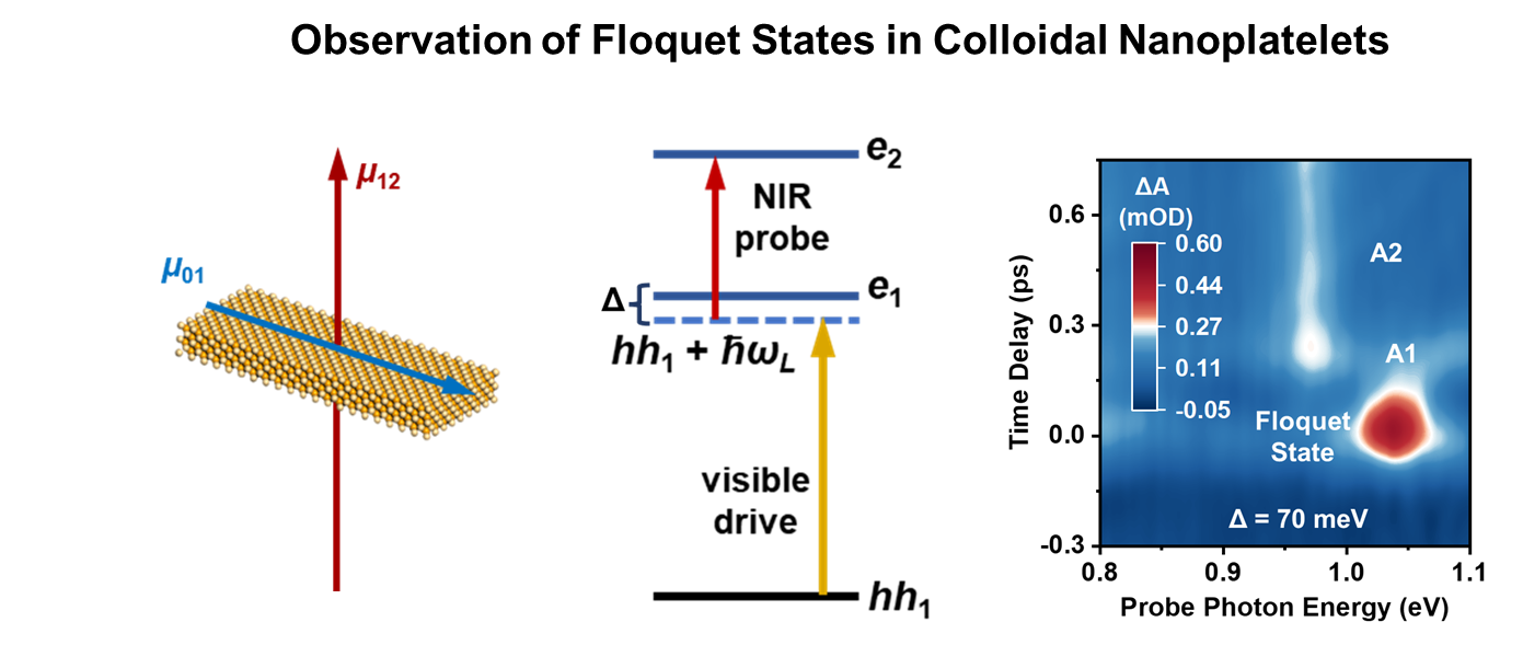 溶液相制备的胶体半导体纳米晶(比如量子点)具有尺寸、形貌易调谐的丰富物理化学性质,近年来成为研究光与物质相互作用的重要平台。吴凯丰团队长期致力于胶体量子点的超快光物理与光化学研究:率先实现了量子点自旋的室温相干操控(Nat. Nanotechnol.,2023);揭示了量子点激子精细结构裂分的新机制(Nat. Mater.,2022);基于量子点三线态传能实现了近红外上转换与光合成(Nat. Photonics,2023);综述了量子点的相干效应及量子信息应用等(Nat. Mater.,2024;Nat. Nanotechnol.,2023)。在这些量子限域的材料中,巨大的态密度被压缩到带边,从而带来了锐利的光学响应,特别适合通过相干驱动带边跃迁来产生弗洛凯态。这些弗洛凯态在自旋相干操控中已经发挥了重要作用,但是其直接光谱观察尚未实现。