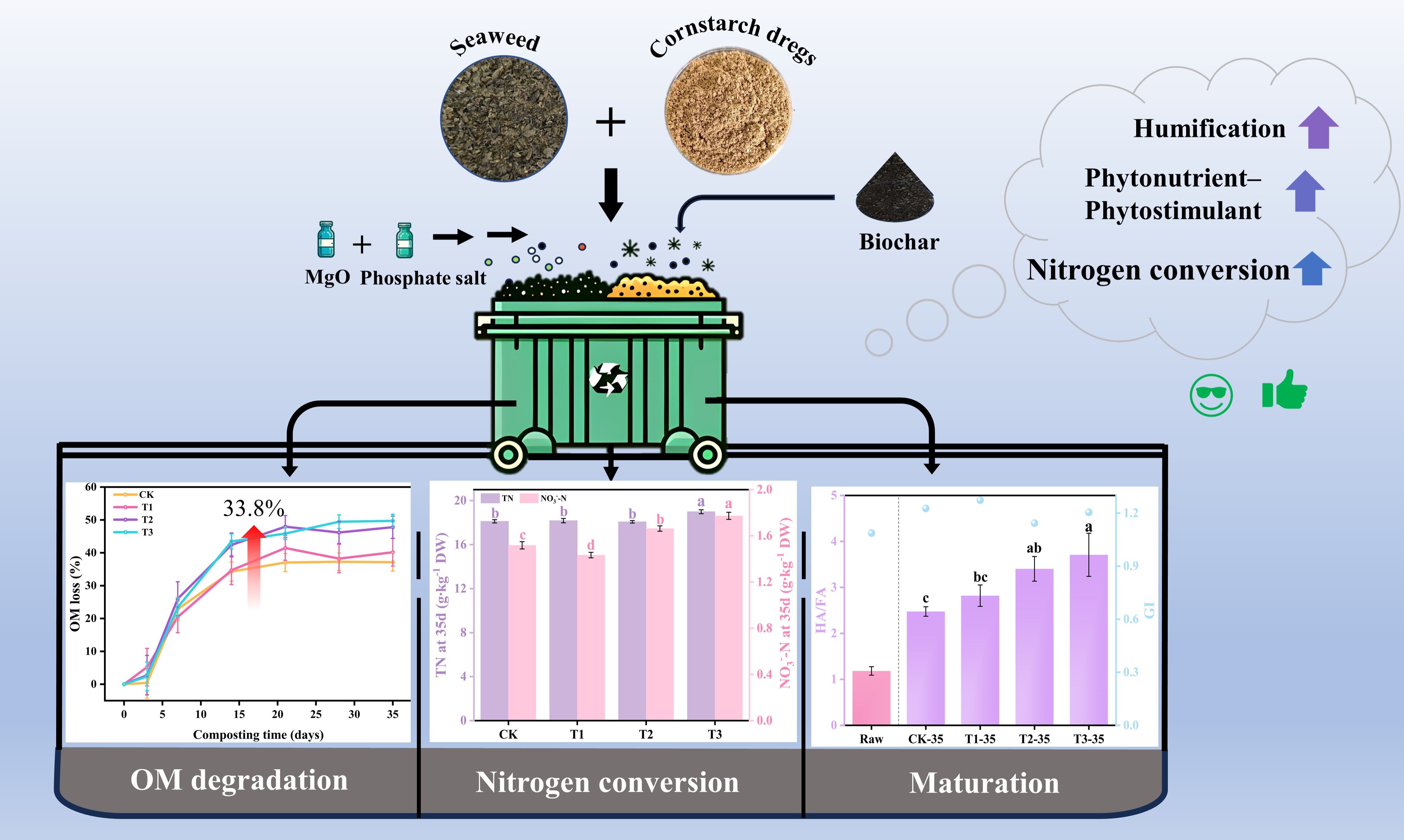 针对海藻和糖渣共堆肥过程研究,探讨了添加5%生物炭(T1)、10%生物炭(T2)和10%牡蛎壳粉(T3)对关键理化性质、产品质量和微生物群落动态的影响。结果表明,所有处理都保留了海藻的植物刺激效应,并促进了海藻酸盐的降解。T1和T2有机质降解效率分别较对照提升31.2%和26.4%。EEM光谱分析揭示,T1和T2腐殖质比例分别增加434%和423%,显著高于对照组(289%)。尤其是10%生物炭处理改善了海藻酸盐的降解和种子发芽指数,推测是海藻中存在生物刺激素和Cobetia属细菌丰度增加所致。微生物宏基因组分析指出,T2和T3显著提高了细菌群落的多样性和丰富度。值得注意的是,牡蛎壳粉虽未能大幅提升腐殖化程度,却有效减少了废弃物的量(OM损失为43.57%,远超CK的35.34%),在维持堆肥质量的同时实现了废弃物减量化。