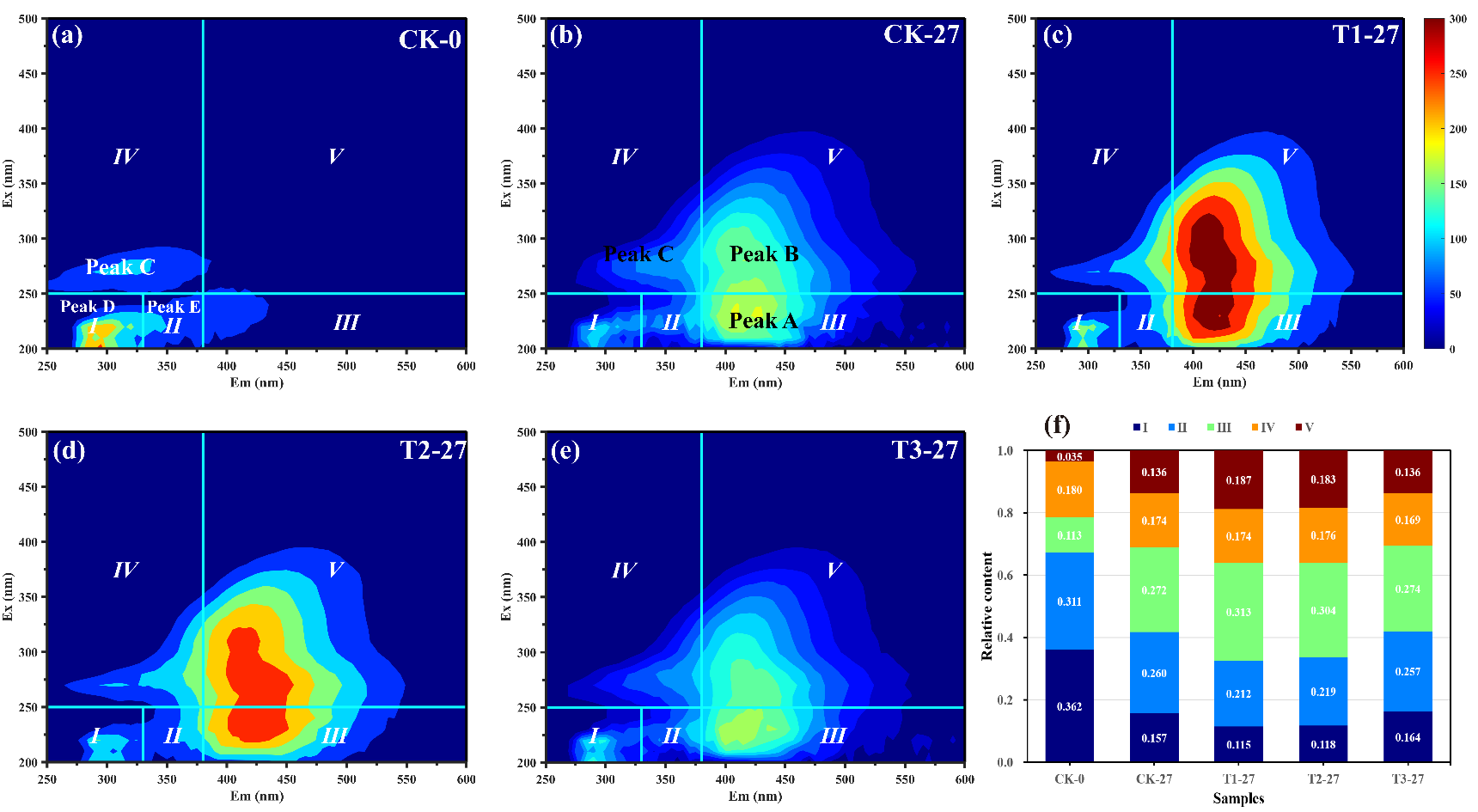 图3?三维荧光光谱?(a-e)?及区域积分体积百分比相对于原样的变化?(f)