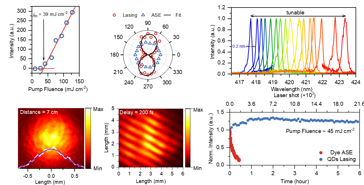 尺寸紧凑、增益寿命长的优点使得该量子点有望在溶液中充当“染料”的角色,实现液体激光输出。团队进一步使用飞秒激光和纳秒激光泵浦量子点溶液,均实现了低阈值的蓝光放大自发辐射,并具有较高的增益系数(约53每厘米)。在纳秒准连续光泵浦下,该量子点溶液在经典的Littrow激光腔中成功实现了激光输出。输出的激光具有阈值低、方向性好(M2约4.7)、线宽窄(0.2 纳米)、可连续调节、相干性好(相干时间约1皮秒)、偏振度高等特点。尤其值得指出,该量子点液体激光可以在不搅拌不循环的条件下实现长时间的稳定输出,比相同波段的蓝光染料分子稳定性高出两个数量级以上。