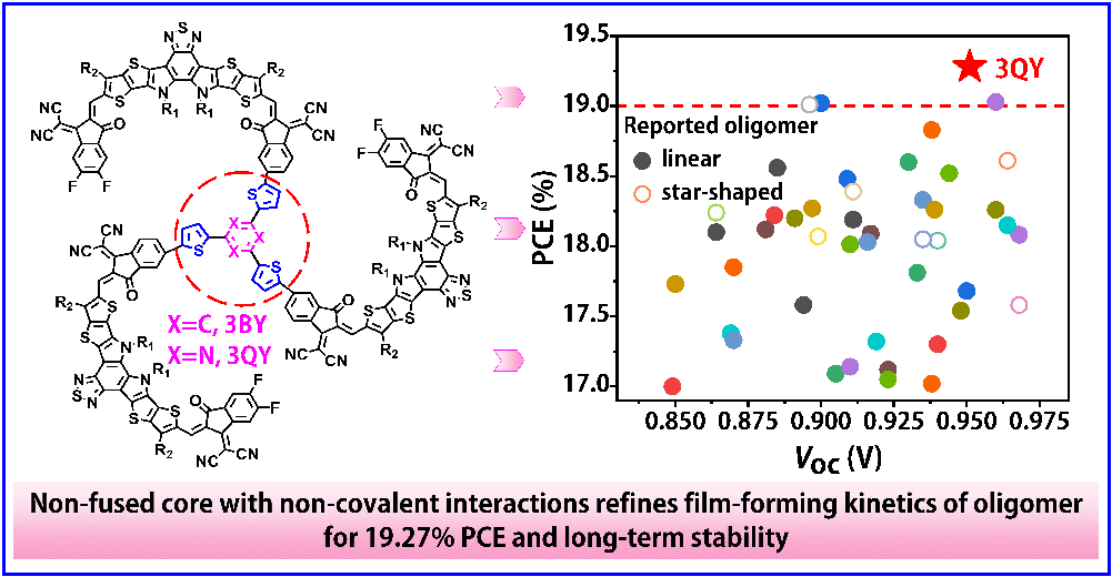 近期,青岛能源所包西昌研究员带领的先进有机功能材料与器件团队在新型多臂寡聚受体的研究中取得重要进展,开发了两类多臂寡聚受体3BY和3QY,并通过调节非稠合核心单元的刚柔度,实现对外围功能臂的构型及聚集态调控,显著提高了OSCs的光伏效率和稳定性。与传统刚性π-稠合核心不同,该研究中采用的非稠合结构赋予材料更高的柔性和适应性,从而减轻了核心单元对寡聚物构型和聚集行为的制约。同时,通过在非稠合中心引入多维非共价键分子内相互作用,实现了对分子间堆积及给受体共混动力学更为精细的优化。最终,以聚合物PM6为给体,基于3QY的光伏电池PCE达到19.27%(权威验证效率18.80%),优于基于3BY器件的性能(17.75%),位列目前已报道的寡聚受体的最高效率。更为重要的是,新型寡聚物的大分子尺寸显著提升了玻璃化转变温度,抑制了电池运行时分子扩散速率,从而增强了光伏器件的稳定性。在80oC连续加热条件下,PM6:3QY光伏电池的T80%寿命(性能衰减到初始效率的80%所需要的时间)超过3000小时。该研究不仅明确了多臂寡聚物受体的结构-性能内在关系,还提出了基于非稠合核心的新型寡聚受体设计策略,为高效且稳定OSCs的研究提供了新思路。