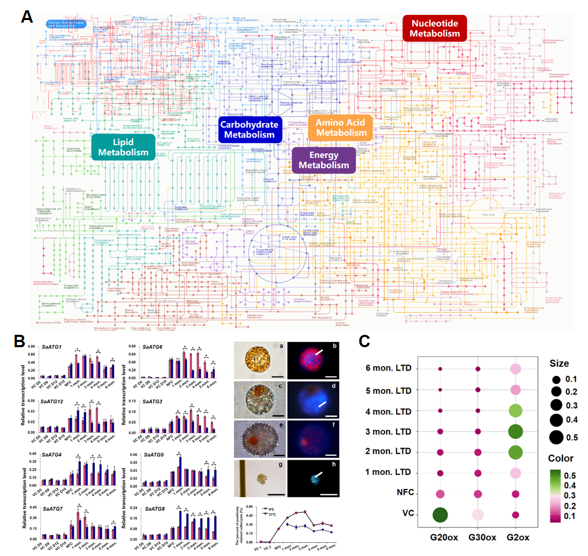 研究团队利用甲藻特有的剪接先导序列作为甲藻核编码基因转录本的“钓钩”,结合三代高通量测序技术对野外采集的海洋沉积物样品中甲藻孢囊集合进行宏转录组测序分析,发现除光合作用之外的大多数代谢和调控通路都维持着一定程度的表达,表明转录水平上保持广泛的代谢通路活跃表达对维持孢囊存活和萌发能力起着至关重要的作用。进一步对细胞自噬和植物激素赤霉素相关的功能基因进行定量表达分析,结合溶酶体染色实验和外源激素添加实验,证实细胞自噬在孢囊维持休眠状态过程中发挥重要作用,赤霉素与另外一种植物激素脱落酸共同作用参与调控休眠孢囊形成和萌发。研究结果为更全面、深入地揭示甲藻孢囊休眠相关分子机制提供了重要的理论依据和研究方向。