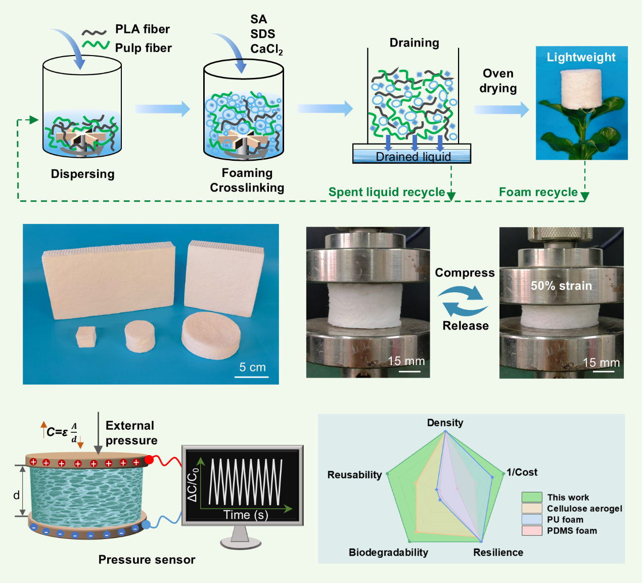 近日,青岛能源所系统集成工程中心木质纤维绿碳材料项目部在木质纤维绿碳缓冲材料研发的基础上,利用湿法发泡和离子交联策略,将纸浆(Pulp)纤维和聚乳酸(PLA)纤维复合,构筑了一种绿色、超弹新材料,可作为介电层,用于超弹压力传感和智能监测等领域。