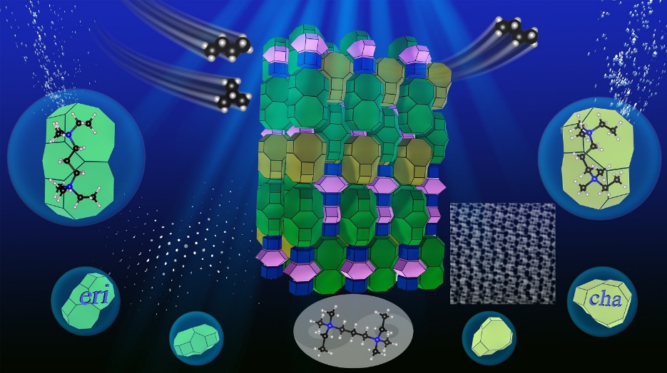 本工作中,科研人员选用双头季铵盐作为OSDA,通过对其碳链长度和端基尺寸进行精细调控,合成了一种全新纳米级小孔磷铝分子筛,并将其命名为“DNL-17”。团队进一步利用三维电子衍射技术直接确定了DNL-17的复杂晶体结构。研究发现,DNL-17属于ABC-6家族,具有小孔8×8×8元环三维贯穿孔道,其骨架结构中包含四种不同类型的分子筛笼(d6r、can、eri和cha),并且沿c轴方向形成了多达24层的复杂堆垛序列(AABAACAABBCBBABBCCACCBCC)。结合理论计算和固体核磁碳谱表征结果,科研人员揭示了DNL-17合成过程中,OSDA采用不同构象来稳定不同分子筛笼。这一发现证实了OSDA可以通过不同构象构建全新磷铝分子筛结构,为新型分子筛的设计合成提供了新思路。此外,研究还发现DNL-17在正丁烷和异丁烷分离过程中表现出了良好的选择吸附性能。