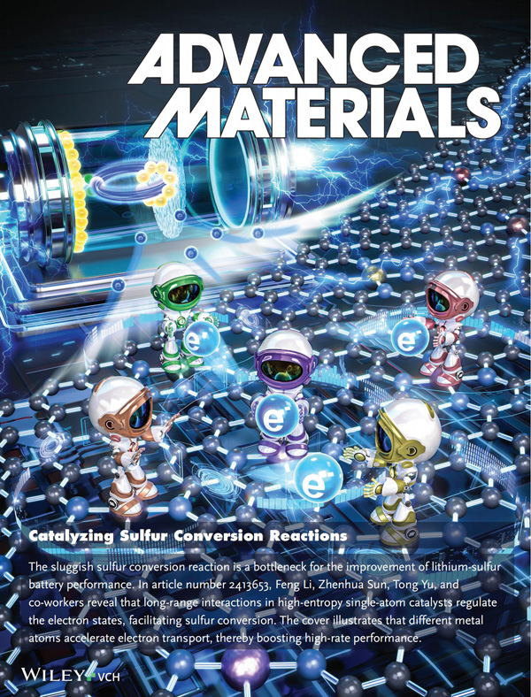 中国科学院金属研究所先进炭材料研究部科研人员在前期研发高效锂硫电池催化剂的基础上(Nat. Commun. 2017,8,14627;J. Energy Chem. 2021,54,452;Energy Storage Mater. 2022,51,890;Adv. Funct. Mater. 2024,34,2308210.),采用第一性原理计算与实验方法相结合,揭开了这一“黑箱”,在单原子催化剂领域取得新进展。研究发现中心金属原子间的长程相互作用是影响催化性能的关键?;谡庖恍氯现?,研究团队实现了对高熵单原子催化剂元素种类和占比的精准定位,有效促进了硫转换反应,显著提升了锂硫电池性能。研究成果近期以“The Role of Long-Range Interactions between High-Entropy Single-Atoms in Catalyzing Sulfur Conversion Reactions”为题发表于材料领域的《Advanced Materials》,因学术价值、创新性、应用潜力入选了扉页论文(Adv. Mater. 2025,37,2413653,图1)和 “Editor's Choice”文章。