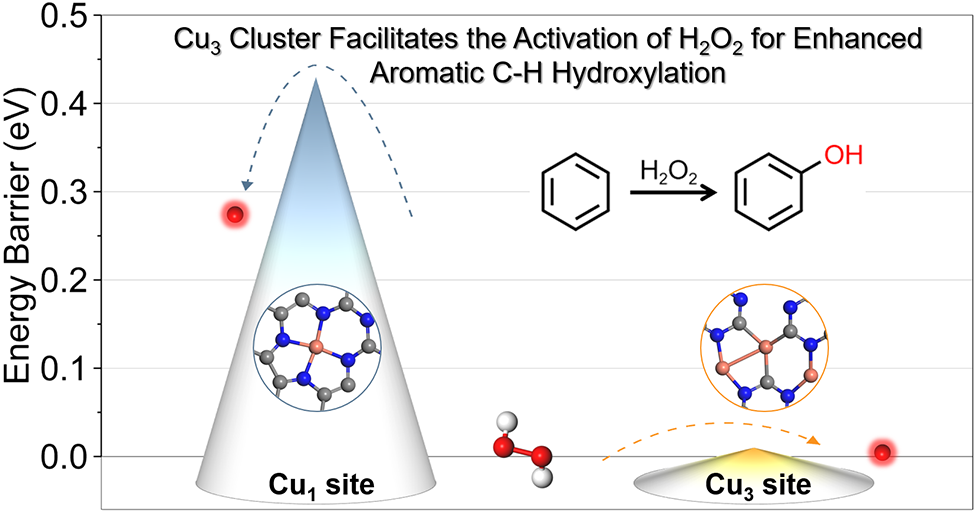 在催化科学领域,单原子催化剂因其独特的催化潜力受到广泛关注,但其本征质量活性受限,制约了其实际应用。为应对这一难题,青岛能源所团簇化学与能源催化研究组基于少原子团簇催化剂精准可控的结构及金属聚集效应等优势,通过原子级活性位点的设计与多原子协同作用的调控,成功构建了氮化碳负载铜原子簇催化剂(Cu3/CN),在苯选择氧化制苯酚反应中展现出优异的催化性能(图1)。研究团队系统的结合原位/非原位表面分析研究,明确了铜位点吸附氧物种(Cu=O*)在C-H键活化中的关键作用。密度泛函理论(DFT)计算表明,相较于孤立的Cu1位点,Cu3原子簇的d带中心位置更高,且与H2O2分子间存在更强的电荷转移作用。这种显著的电荷转移效应促使H2O2分子中O-O键拉伸,有效促进了Cu=O*活性物种的形成。