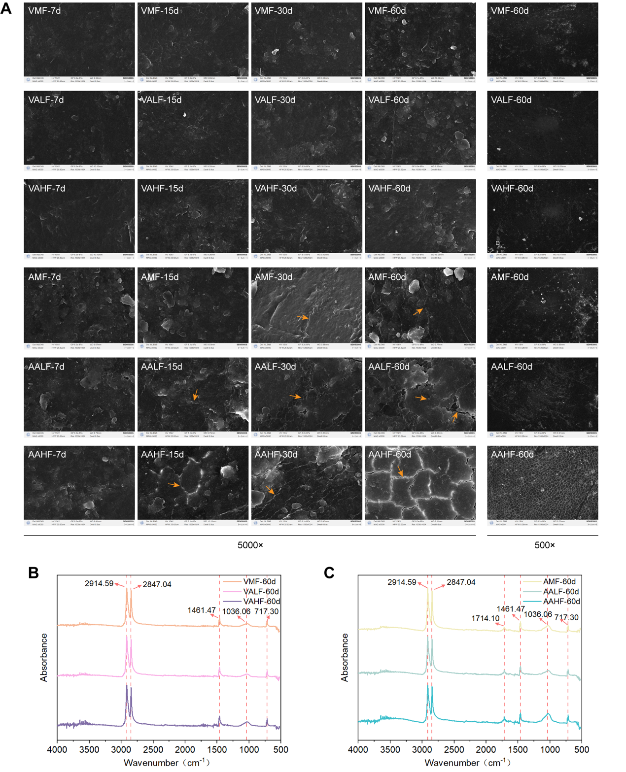 图1 乙草胺对地膜微塑料老化的影响 (A)场发射扫描电镜表征;(B)、(C):60天红外光谱表征