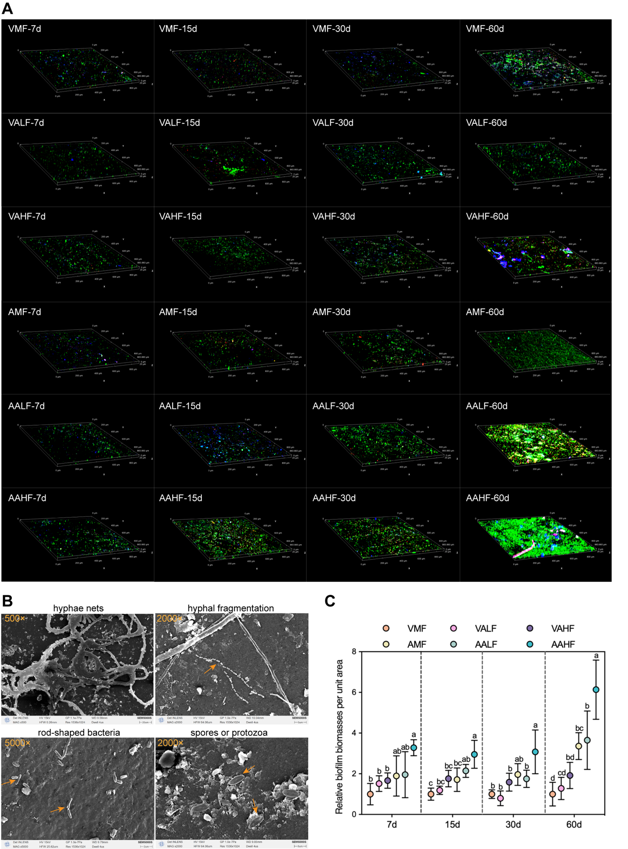 图2 地膜微塑料表面生物膜结构和相对定量 (A)地膜微塑料表面生物膜立体结构;(B)地膜微塑料表面的微生物形态;(C)生物膜单位面积相对生物量。p < 0.05
